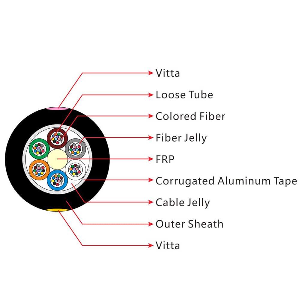 The fibers, 250μm, are positioned in a loose tube made of a high modulus plastic. The tubes are filled with a water-resistant filling compound. A Fiber Reinforced Plastic (FRP) locates in the center of core as a non-metallic strength member. The tubes (and fillers) are stranded around the strength member into a compact and circular core. After an Aluminum Polyethylene Laminate (APL) moisture barrier is applied around the cable core, the cable is completed with a PE sheath.