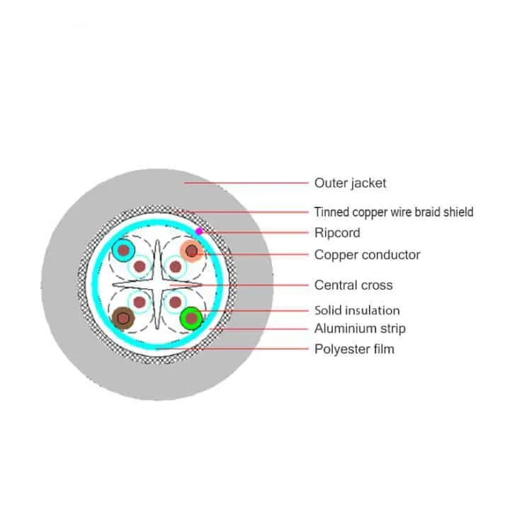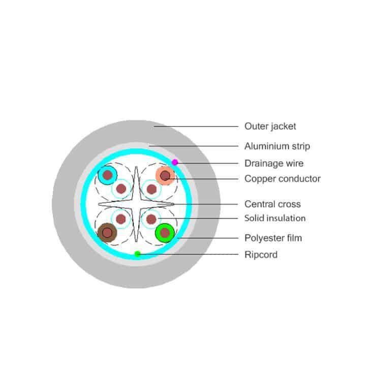 CAT6 Plenum Cable is a type of Ethernet cable specifically designed to carry data signals in plenum spaces. It has been made with a special kind of plastic known as polyethylene terephthalate (PET), which is flame-resistant and designed to prevent the spread of fire in the event of an emergency. This cable contains eight stranded copper wires, each measuring 26 gauge, that are wrapped together and covered by an outer insulation layer. Structurally the CAT6 प्लेनम निम्नलिखित घटकों से मिलकर बनता है।